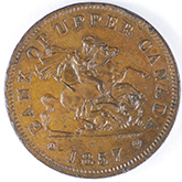 FC | 22729 S | 1857 | CANADA | 1 Penny Token | Bank of Upper Canada | St. George Slaying Dragon0 | Copper | PC-6D | Uncirculated | $165.00 | |||