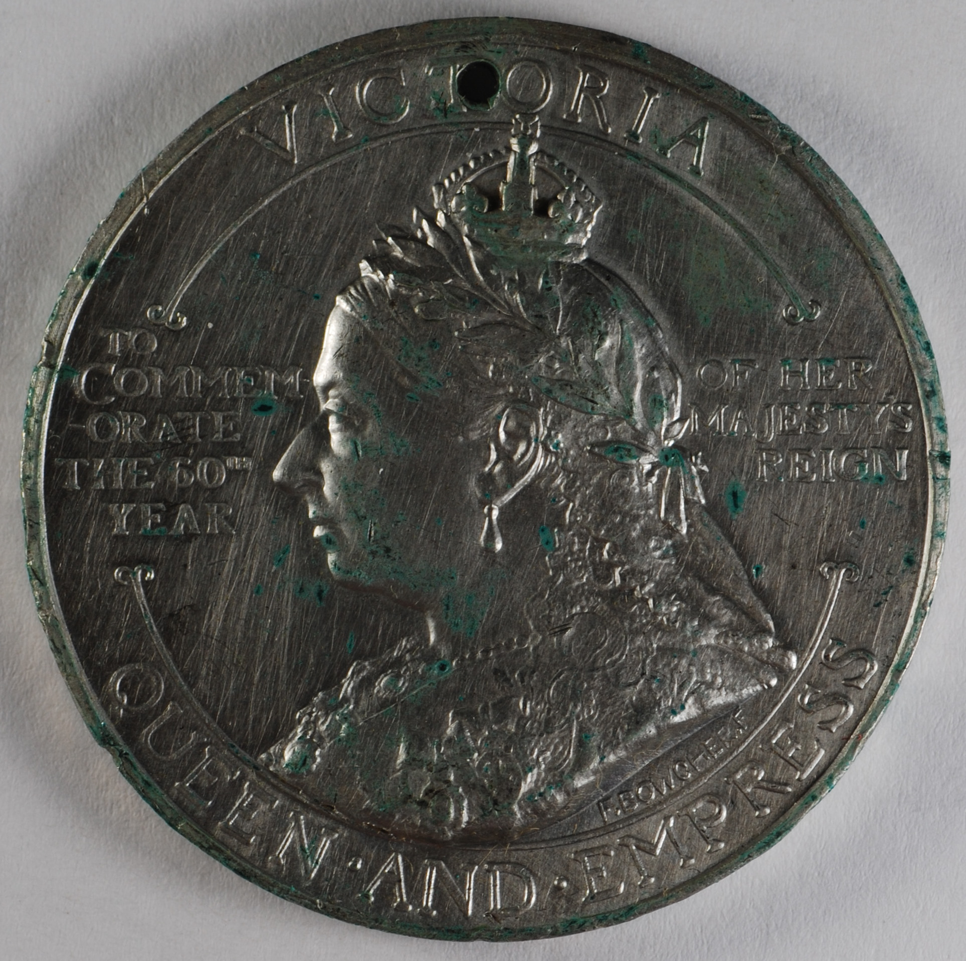 | FC | 35107 | 1887 | GREAT BRITAIN | Medal | Queen Victoria, 50 Year Jubilee | Crowned 1838, Married 1840 | White Metal | Extremely Fine, Holed | $25.00 | ||||