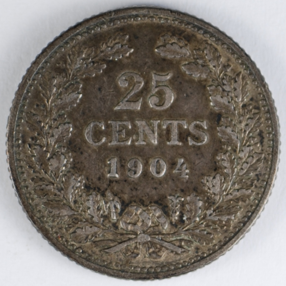 FC | 38829 | 1904 | NETHERLANDS | 25 Cents | Wilhelmina I | Value and Date within Wreath | 0.64 | 0.0736 | Silver | 120.2 | Extremely Fine | $60.00 |