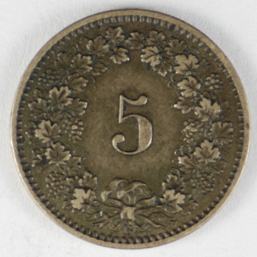 FC | 33406 | 1892-B | SWITZERLAND | 5 Rappen | Crowned Head Right | Value Within Wreath | Copper-Nickel | 26 | Extremely Fine | 35.00 | ||