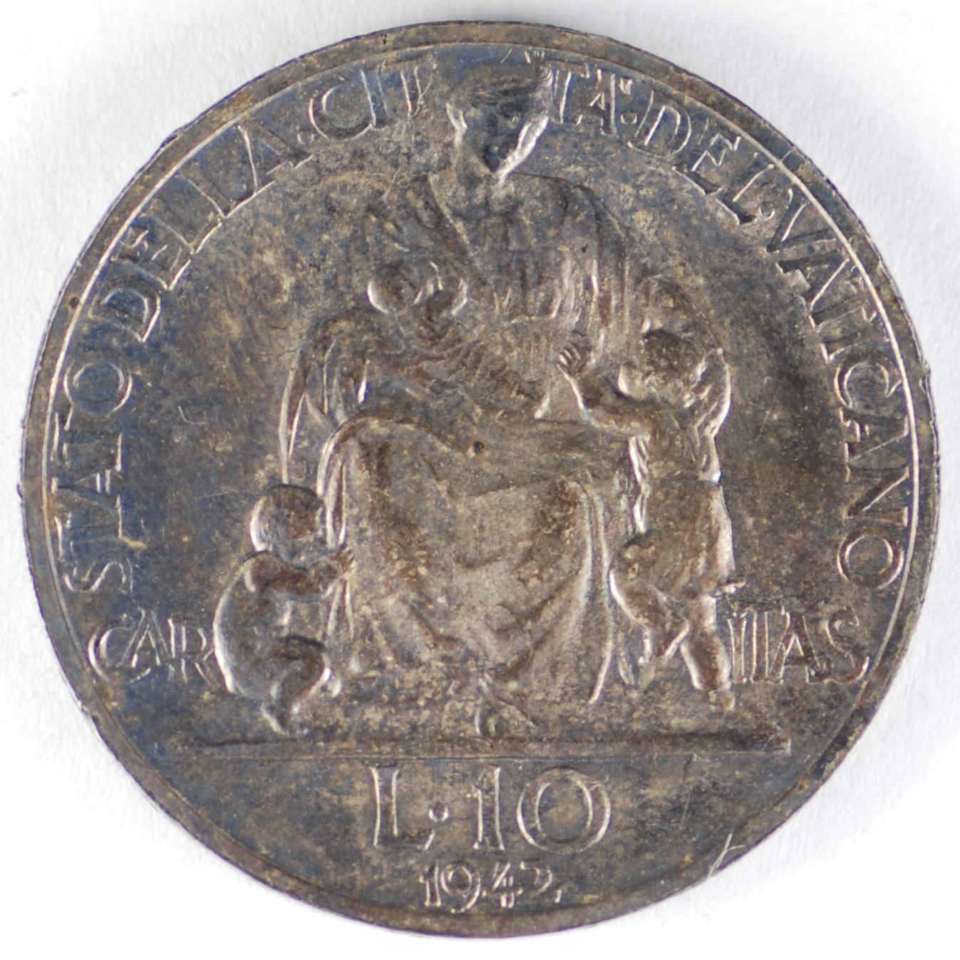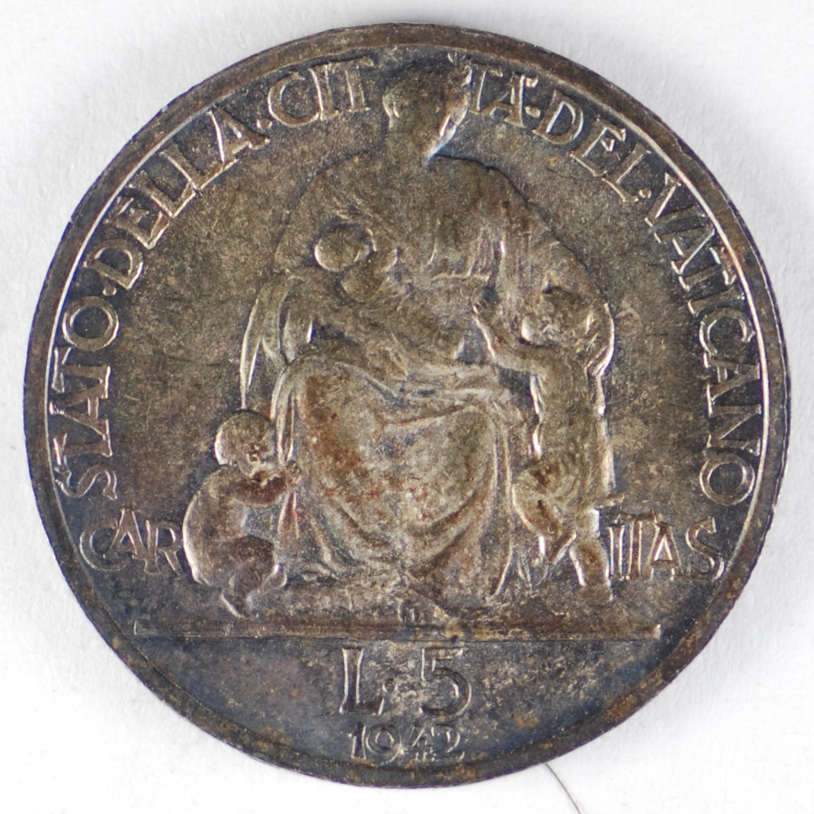 FC | 36689 | 1942 IV | VATICAN CITY | 5 Lire | Caritas, Children; Mintage: 4,000 | Pope Pius XII | 0.835 | 0.1342 | Silver | 37 | MS-63 | $70.00 |