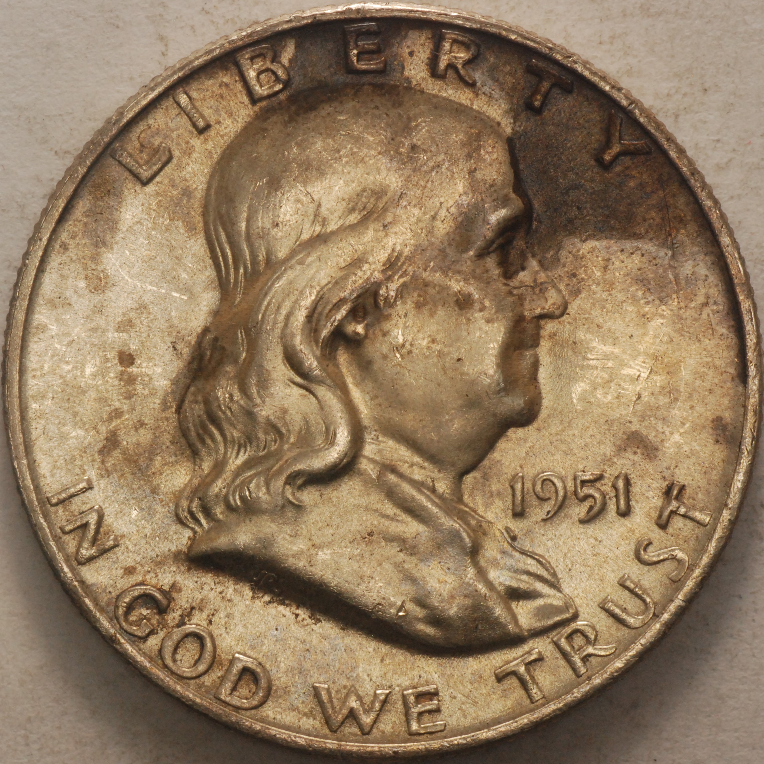 1951 | Franklin Half Dollar | End of Roll Toning, Obverse | MS-64 ERT | $50.00 | ||